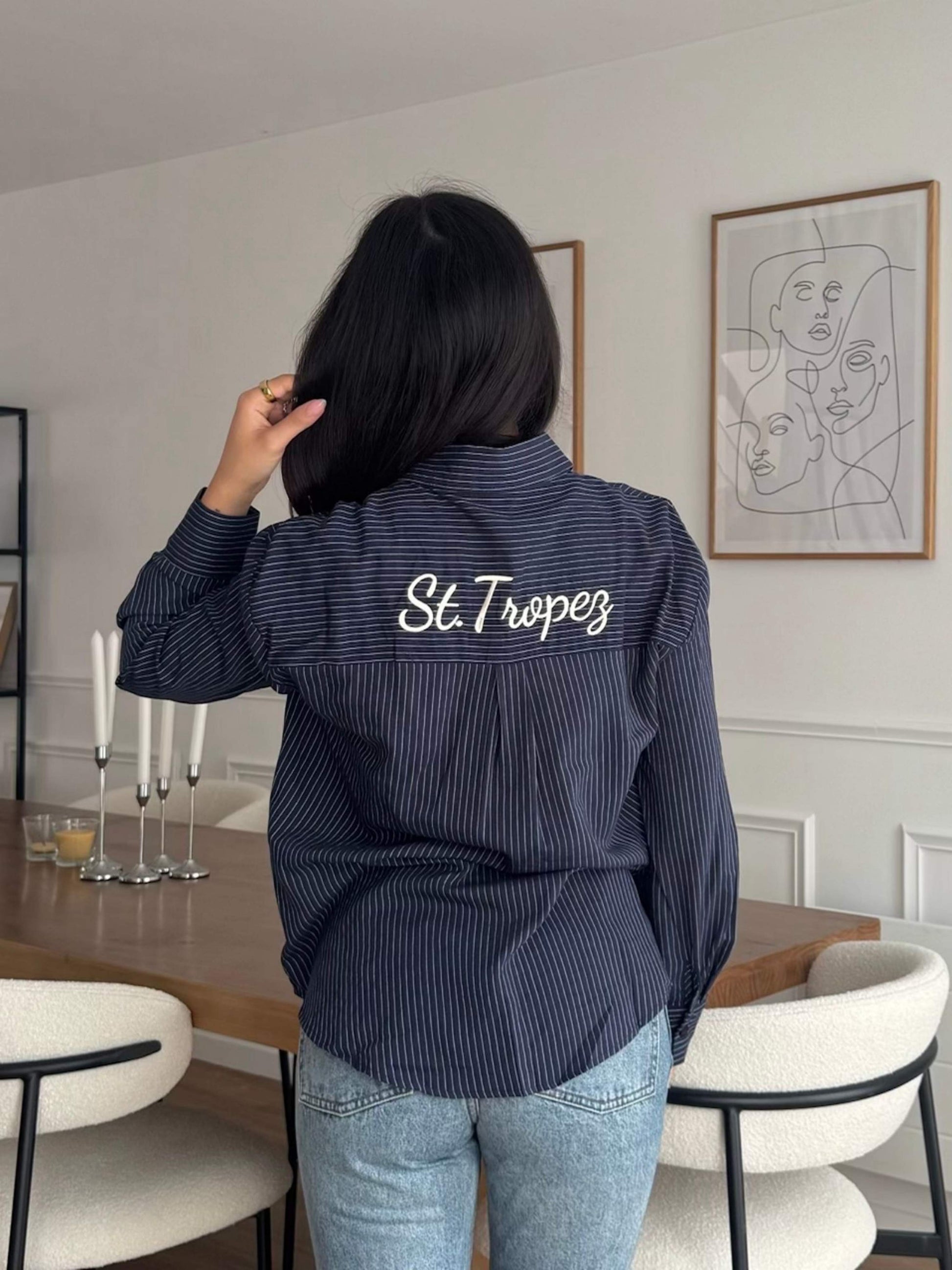 La chemise TAMMY marine allie élégance et modernité avec ses rayures bleu marine raffinées. Sa broderie St Tropez, délicatement placée au dos et à l'avant, apporte une touche distinctive et sophistiquée, parfaite pour un look à la fois chic et décontracté.