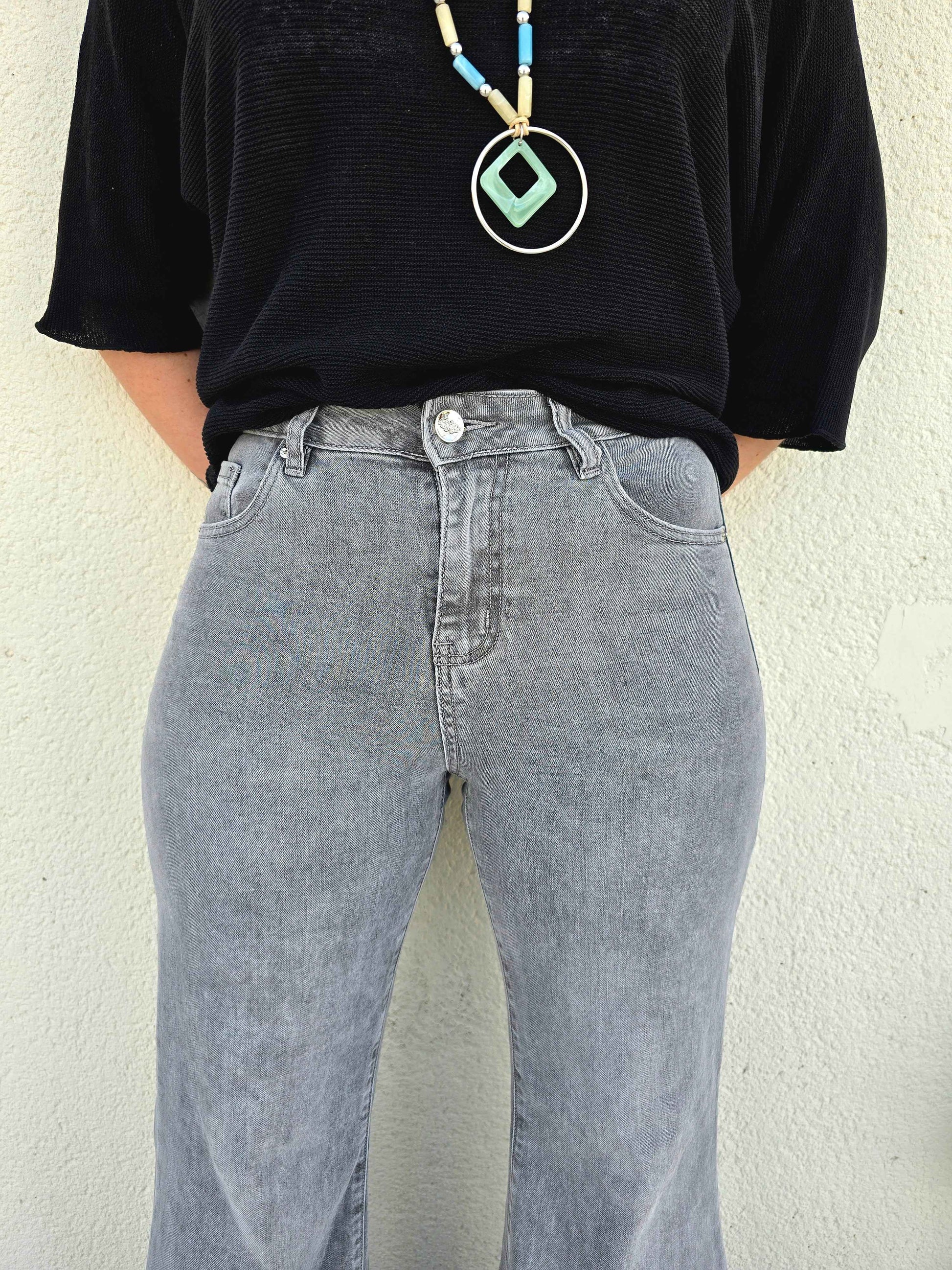 Découvrez les jean Greg Gris, parfaits pour une silhouette élégante et confortable. Avec leur taille haute et leur coupe super flare, ces jeans en coton doux et stretch mettront en valeur vos courbes et vous garderont à l'aise toute la journée. Ajoutez une touche de style à votre garde-robe dès maintenant !