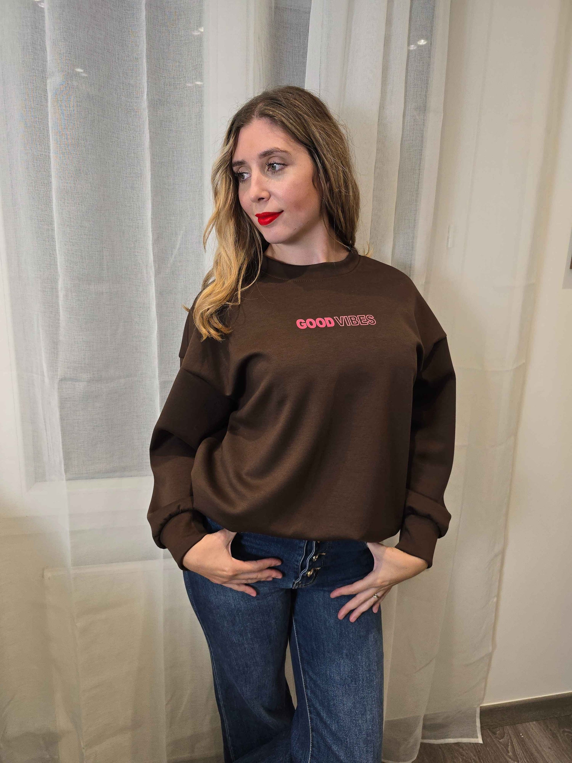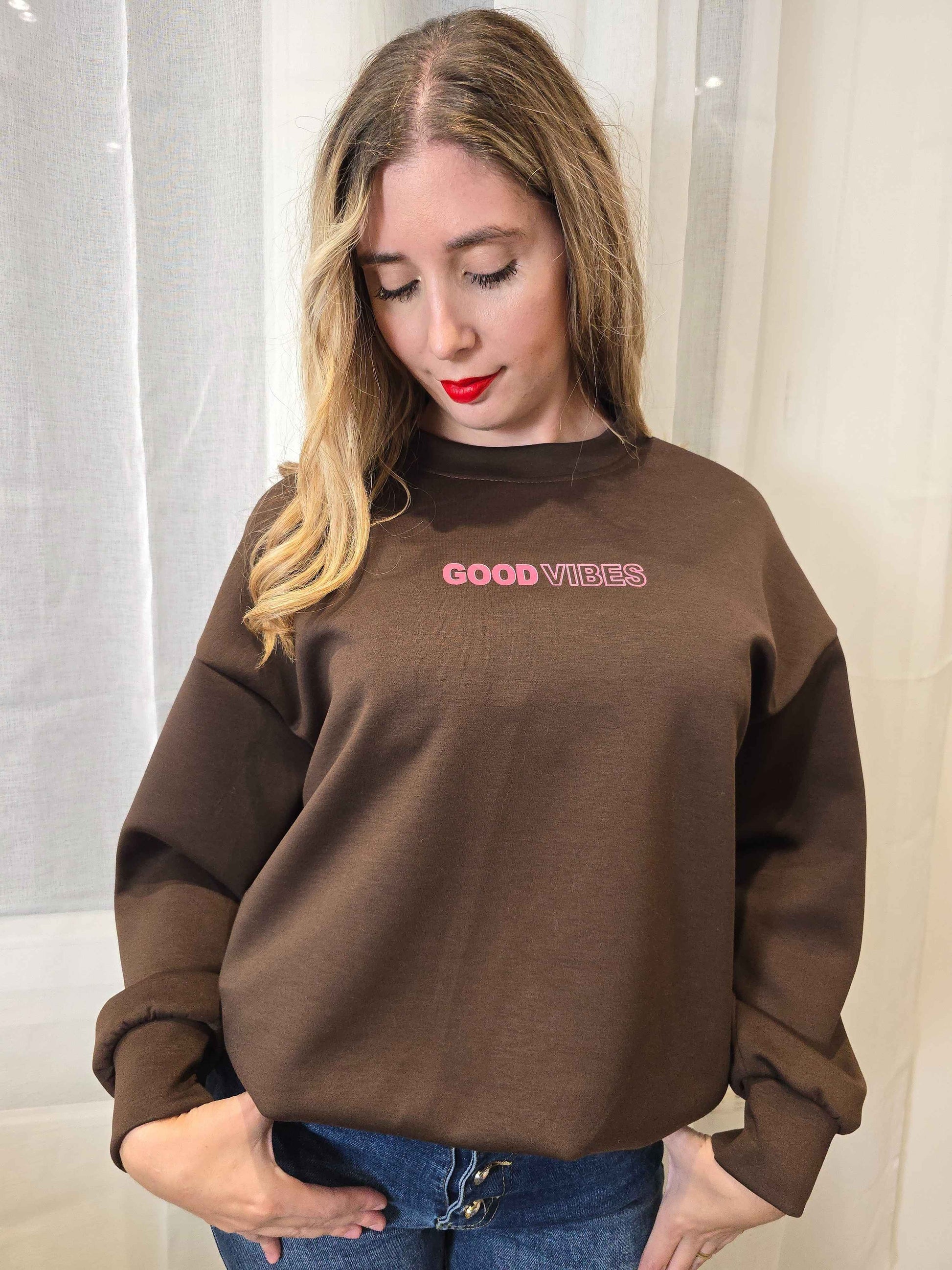 Le doux chocolat JOAQUIN affiche un style super fun grâce à ses écritures "Good Vibes" en rose fluo qui captivent le regard. Confortable et tendance, il vous accompagne avec énergie et bonne humeur, parfait pour dynamiser vos tenues quotidiennes avec une touche colorée et positive.