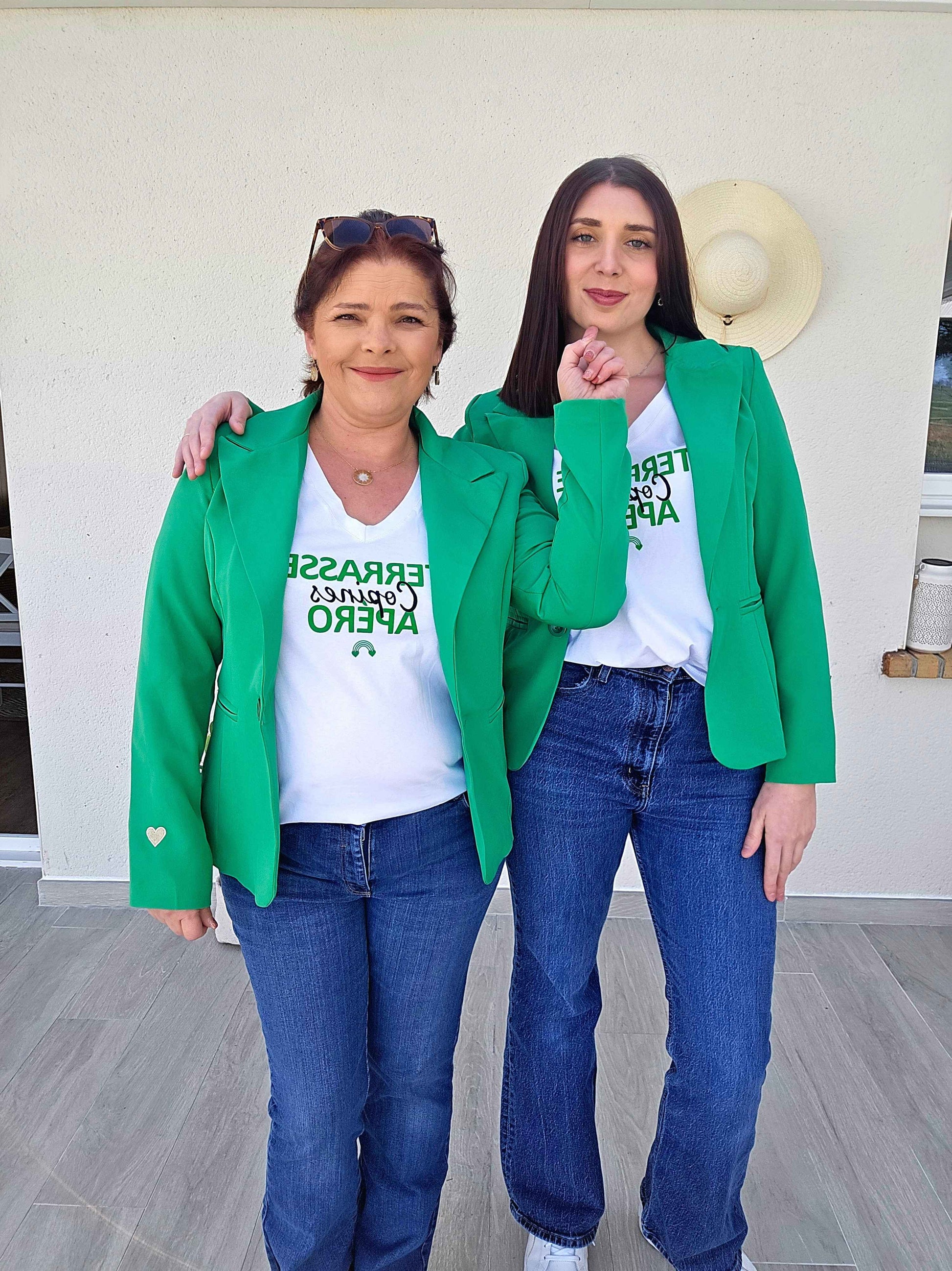 Découvrez notre veste blazer Donna Verte alliant confort et élégance avec sa coupe cintrée et son tissu fluide. Le cœur doré brodé sur la manche gauche ajoute une touche de modernité à cette veste verte. Idéale pour une allure chic et tendance.